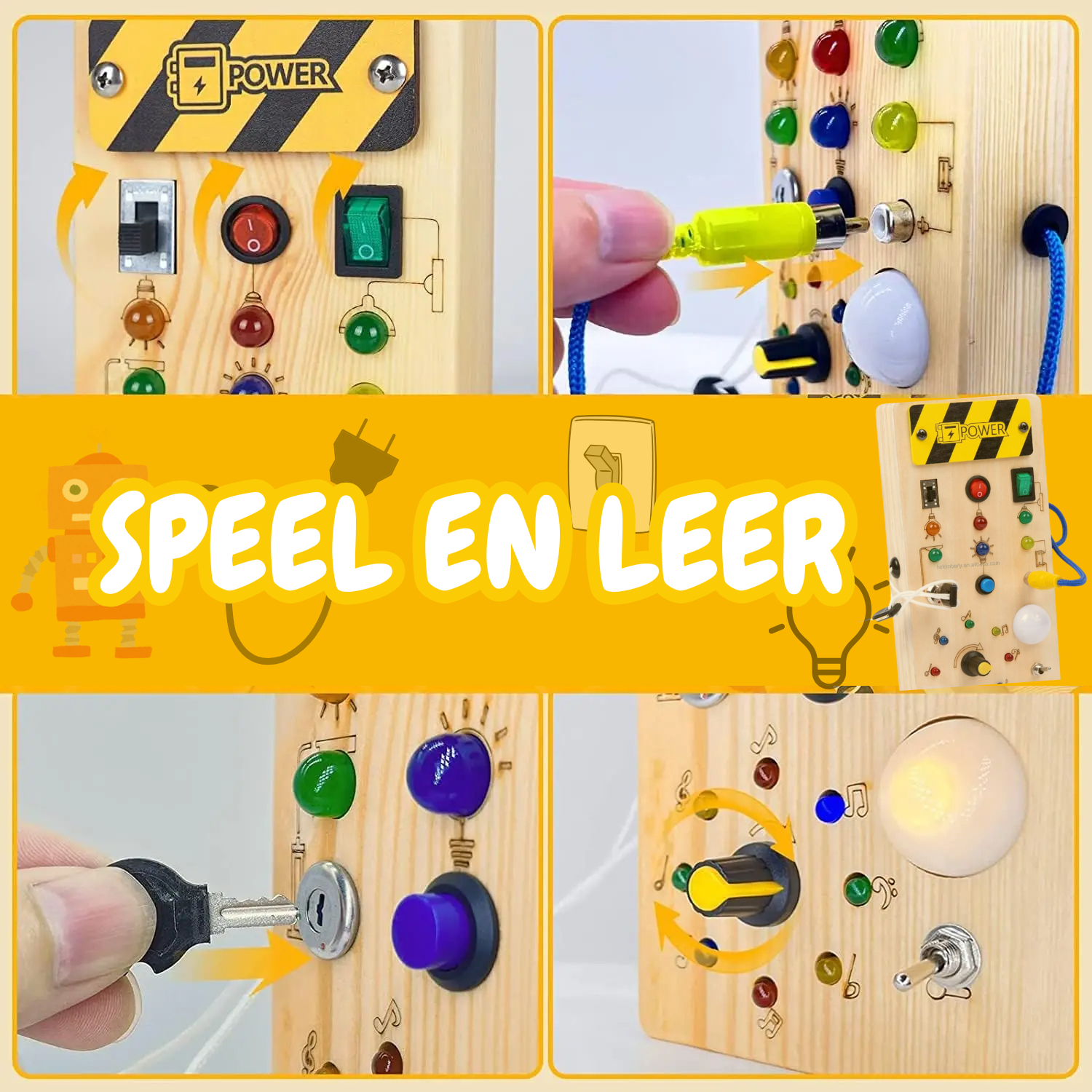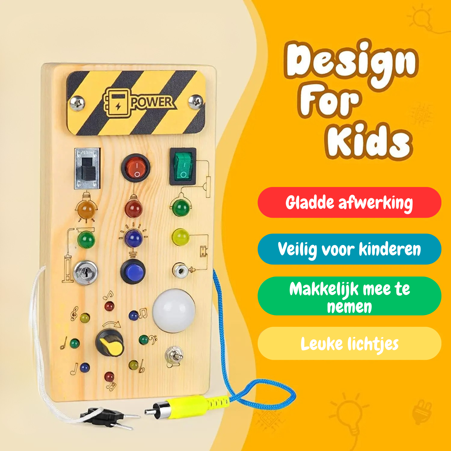 Interactief houten busy board met LED-lampjes en schakelaars. Stimuleert zintuigen, fijne motoriek en oorzaak-gevolg. Ideaal Montessori speelgoed voor kinderen vanaf 3 jaar.